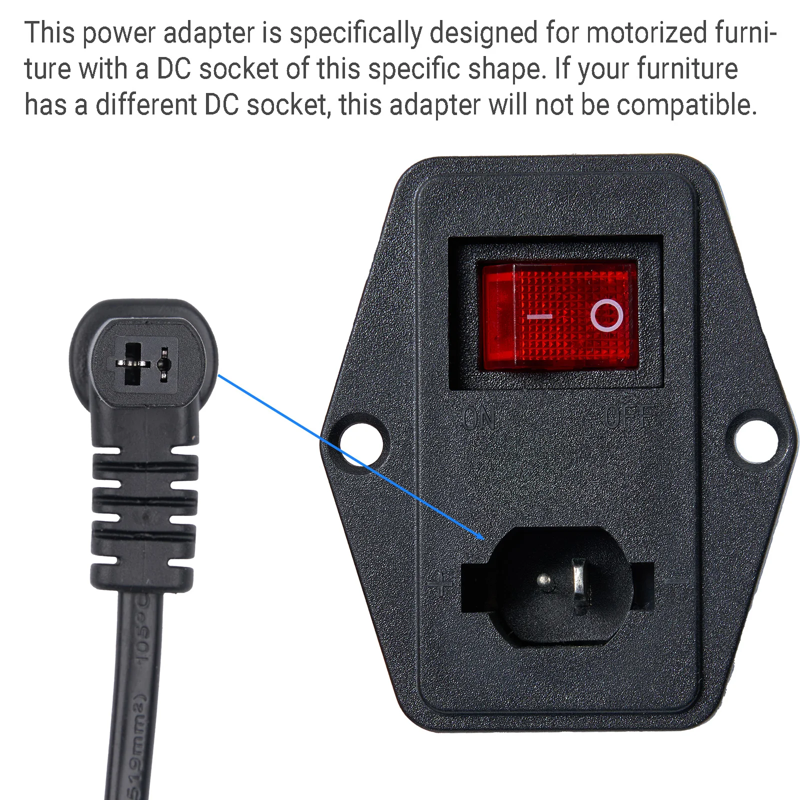 This power adapter uses a 90° (right angled) female 2 pin plug, it is specifically designed for motorized furniture with a DC socket of this specific shape. If your furniture has a different DC socket, this adapter will not be compatible.